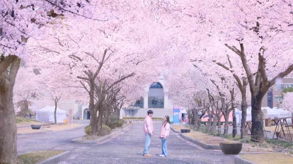 Eun Ho and Mi Rae’s first meeting with the typical cherry blossom background