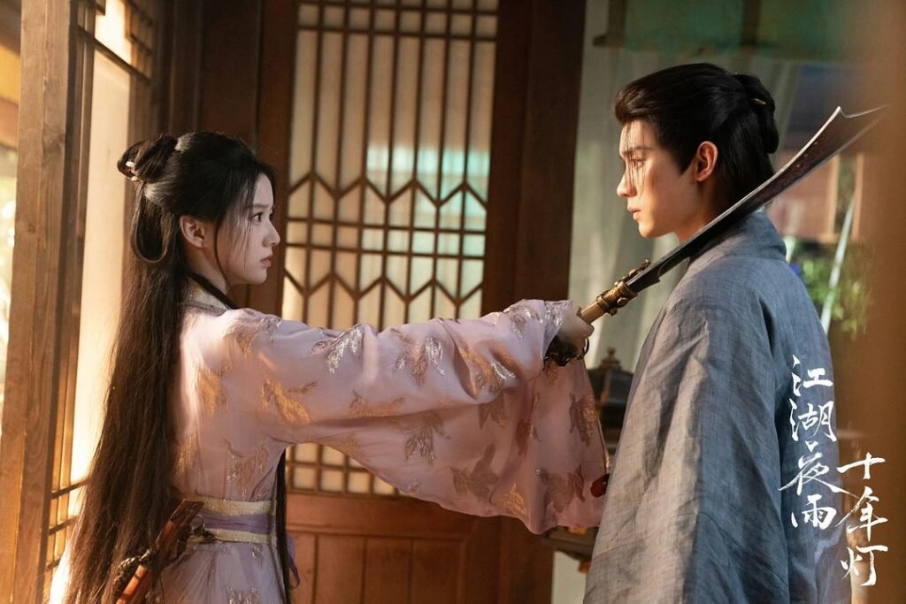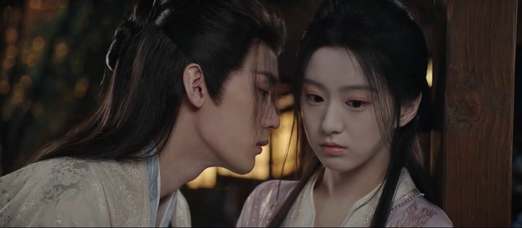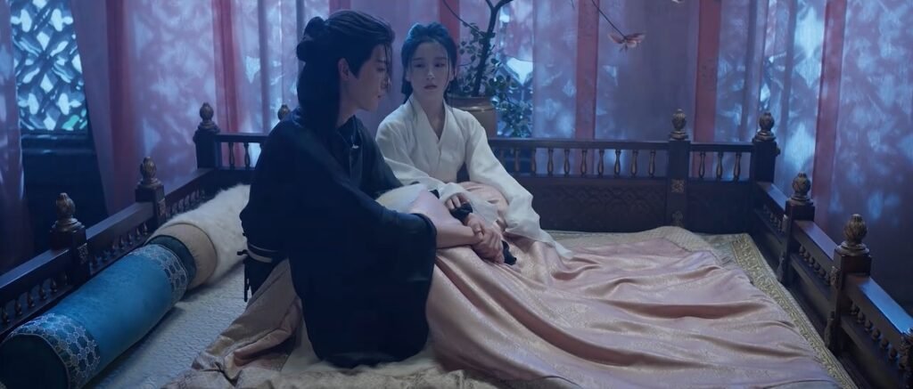 Cai Zhao found out Qingyan’s lie soon when she saw the remains of Xungu Grass in his medicine. It was an herb that mimics illness. She realized that he had lied to her to be by his side and to lure out enemies, so she packed up. Before she left, she confronted Qingyan. Qingyan dropped his act and forbade her from leaving, but Cai Zhao put her blade to his neck! This is the scene for the featured image of Part 2.