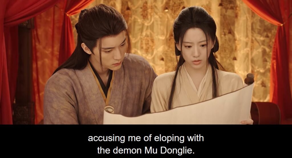 They also found a beautiful wedding chamber, which belonged to another Li Sect leader, Mu Donglie, and his wife. Cai Zhao was shocked when she found out that her ancestor was the wife who was accused of being a demoness/rebel by eloping with a demon. Upon reading her ancestor’s diary, she and Qingyan found out what happened back then.