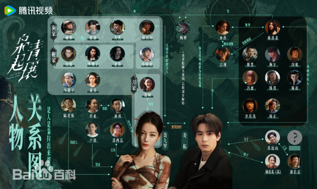The chart is divided into two big groups: the Nanshan Hunters (light green), that connected to Jiuluo, and the Earth Fiends/Roadside Chemical (dark green), that connected to Yan Tuo. The rest are Jiuluo and Yan Tuo’s family members.