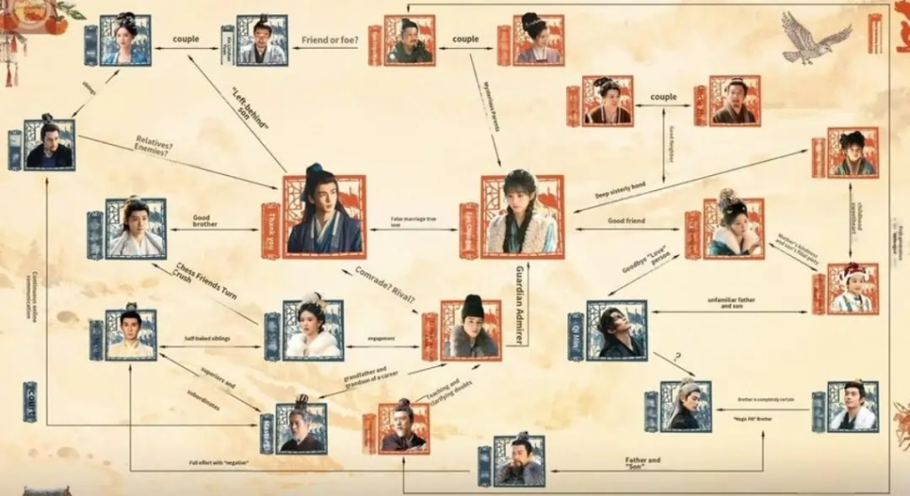 This translated chart is uploaded on MyDramaList by Slim Xtra. More character info: DramaWiki.