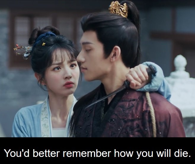 I told you that Sui Yuanqing wouldn’t die, right? He was saved by Shi Sanniang, the female bandit chief of Qingfeng Stronghold. She fell in love with him, so he paid her and the bandits to attack Lin’an, to find Changyu, whom he could use as leverage against Xie Zheng. They killed everyone who didn’t want to tell the whereabouts of Changyu: Constable Wang, Chef Li, Changyu’s neighbors, even Magistrate Cui and his daughter, who were grateful to Changyu in the previous episode. The wretch Mrs. Song was the one who told the bandits where Changyu lived, but she was killed, too. Changyu, Mrs. Zhao, and Changning took refuge in a shelter. Changyu lured the bandits away to save Mrs. Zhao and her sis, but was caught by the bandits. She managed to escape, and Yuanqing cornered her at the cliff. Refusing to surrender, with a mocking smile, Changyu threw herself down the cliff.