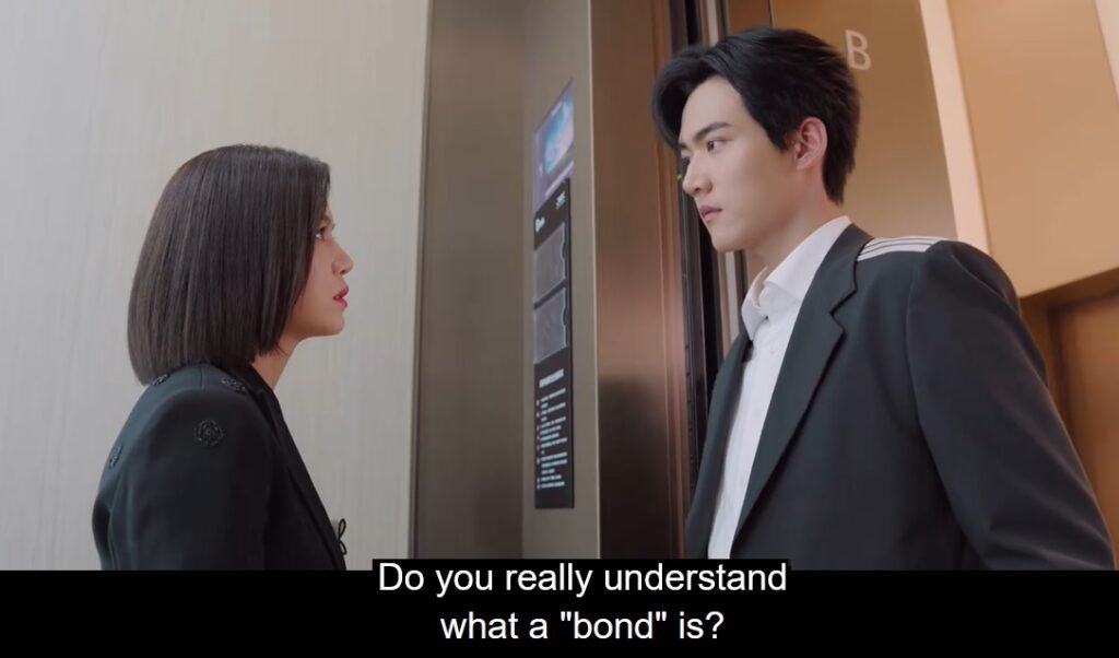 While walking to work, Cen Jin saw a man who resembled Li Wu, whom she had last seen was six years ago, walking across the street. She was more surprised because the man was indeed Li Wu and, shockingly, he was the rep of a collaborating company, Tongchen Tech. During her presentation, Li Wu challenged her choice of the word “bond” she used, and he seemed give her a hard time if her business partner Mrs. Shen didn’t intervene. Later, she met Li Wu in the elevator. He asked if she understood what “bond” was. Love and hate were bonds, but never ignorance. She never contacted him over those years. Without responding, Cen Jin left Li Wu and their unresolved grudge in the past.