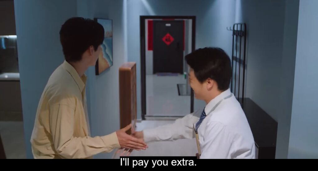 On the weekend, after Li Wu found out that Cen Jun planned to visit her parents, he was already at their home earlier than Cen Jun! He coaxed Mrs. Cen to ask her daughter to accompany Li Wu looking for an apartment, since he planned to settle in Yi City, and he was still staying at a hotel. While looking for an apartment, he was very picky and dissatisfied with every place, until the agent mentioned the last one. Li Wu was reluctant at first, but the agent persuaded him until Cen Jun said that if he liked it, he should sign the paper, since she needed to go. After that, she walked out… to her apartment across the hall! Apparently, it was Li Wu’s trick, and he would pay the agent handsomely.