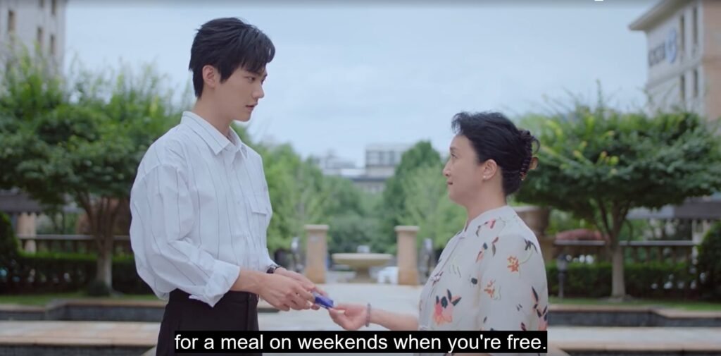 Li Wu won bidding against his company’s rival (with his former employee), so with a secured feature of his company, it was time to face the last villain challenge, Cen Jin’s mom. They visited Mr. and Mrs. Cen together. Mom pretended she ran out of drinks and asked Li Wu to accompany her to the store. Time for the ‘talk’. Mom expressed her worry about her daughter and her relationship with Li Wu, to whom he solemnly promised that he would always be Cen Jin’s shield and support. Mom then agreed to the nervous Li Wu, gave him her handkerchief to wipe his sweat, and invited him for weekend meals if he had time.
