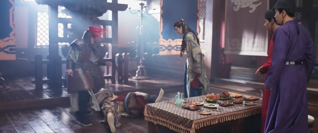 After the negotiation, Xiao Jinyu and Jingyi invited First Prince and Second Prince to eat. Suddenly, there was a Tang soldier who took a knife and slit the First Prince throat, and then committed suicide. You Chen An accused the Tang of killing the First Prince and threatened to kill himself if Xiao Jinyu and Jingyi didn’t let him go, so they had to let You Chen An leave.
