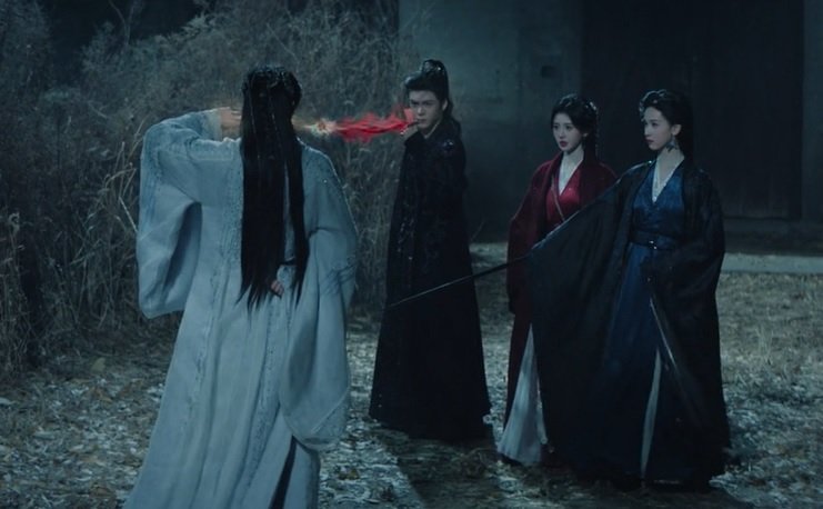 Wangyan and Shiguang finally came out of the paint, at the right time when the others fought Ji Ling who snatched the goat horn pendant. Wuyi came in, all bloody, and lied that Ji Ling injured her because she found out about his collusion with Jiu Ying. Ji Ling was shocked by Wuyi’s betrayal, but he didn’t say anything. The group believed her.