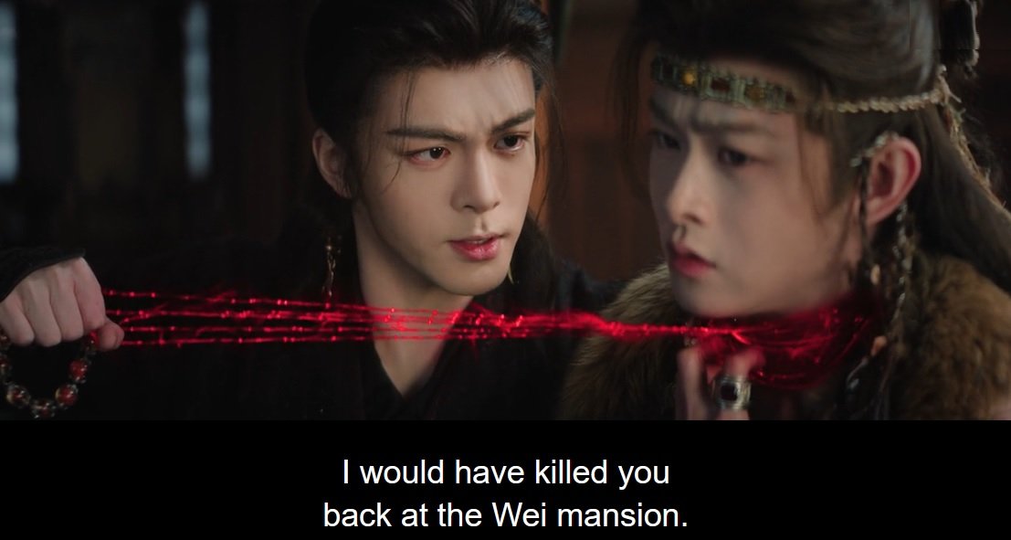 Back to the current time with Wuyi and Chi Wen. She suspected Chi Wen and Ji Ling were the same person, so she flirted with him. This Chi Wen was not Ji Ling; he was super cold and ruthless. After choking Wuyi’s neck, he returned her jade pendant and a safety token and ordered her to leave